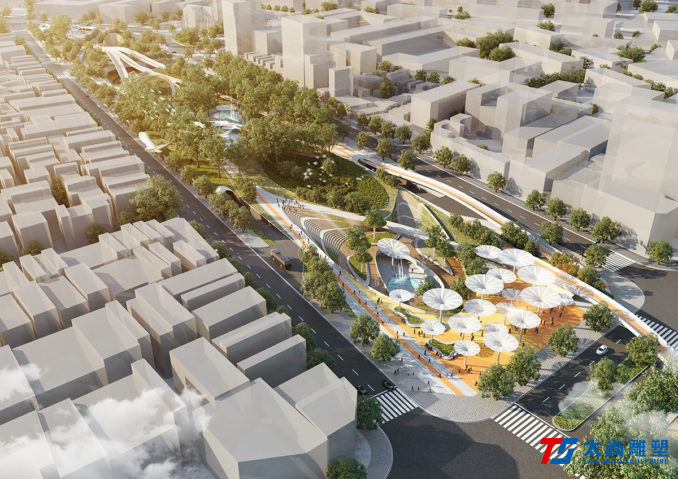 太尚雕塑的設計解釋是一個關鍵的設計元素。主要的步行和活動網絡通過沿著場地前鐵路曲線的人行道被輕輕抬高,提醒游客其過去的城市結構。它們勾勒出主動和被動空間的混合,使我們能夠創建一個高度連接和可滲透的公園空間,同時最大限度地保留并最大限度地減少對場地現有成熟樹木的影響。人行道的末端是一個戲劇性的扭曲鋼雕塑,進一步紀念了基礎設施的歷史。